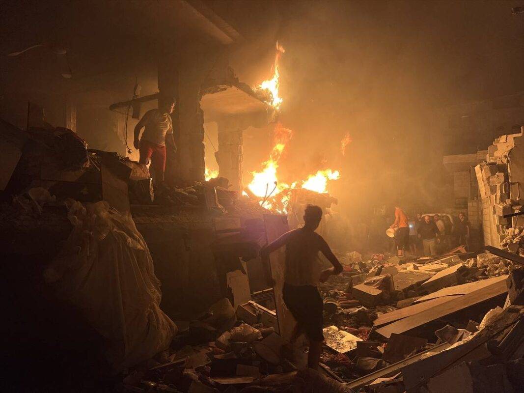 Equipes de defesa civil e residentes palestinos extinguem o incêndio e o trabalho de busca e resgate na casa da família Al-Salhi após ataques israelenses ao campo de refugiados de Nuseirat na cidade de Gaza. Entre as vítimas mortais estão 2 crianças. [Hassan Jedi/Agência Anadolu]