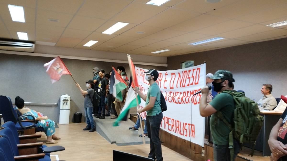 Após meia hora da palestra, ativistas entraram no auditório com cartazes e símbolos pró-Palestina, em um protesto realizado “em defesa da vida das crianças palestinas”. A ação teve êxito e encerrou a palestra.