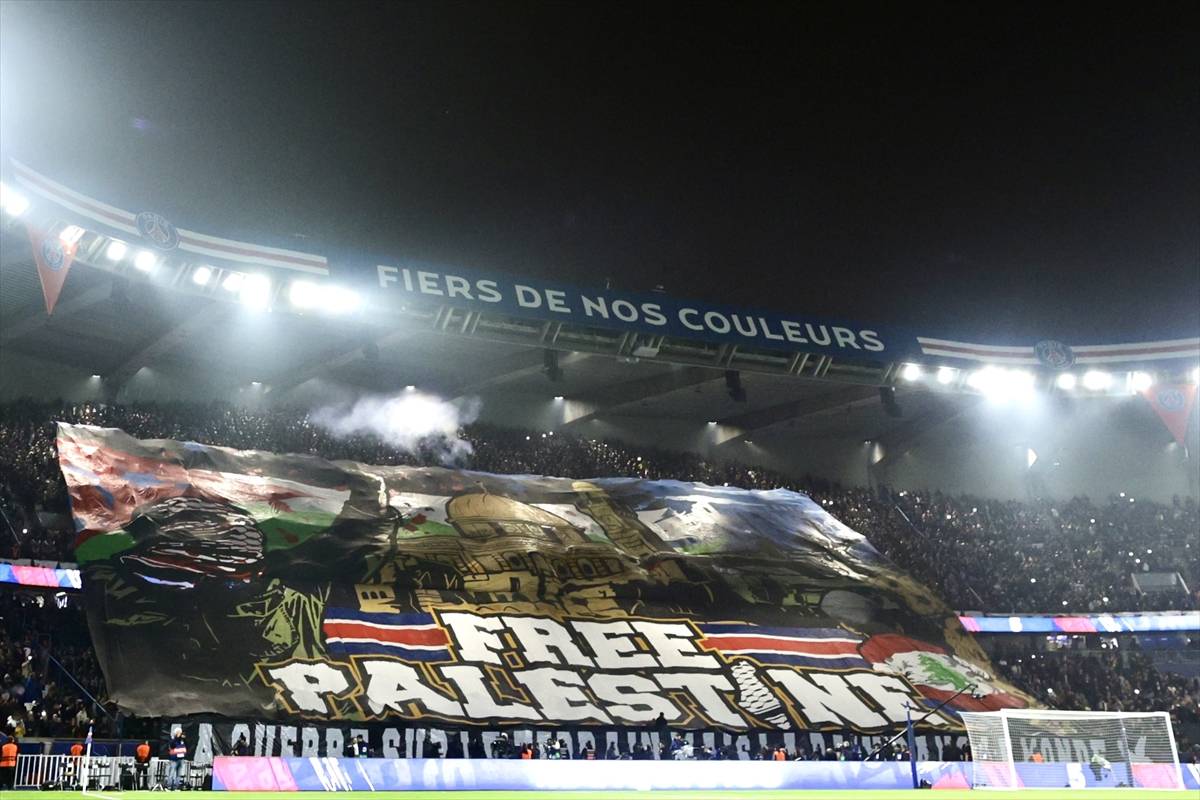 Torcida do clube francês Paris Saint-Germain (PSG) estende bandeira pró-Palestina nas arquibancadas do Parc des Princes, em partida da Liga dos Campeões da UEFA contra o Atlético de Madrid, em Paris, 6 de novembro de 2024 [Ibrahim Ezzat/Agência Anadolu]