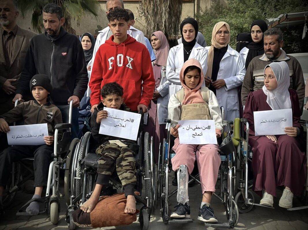 Crianças palestinas que perderam os membros devido aos ataques do exército israelense fazem uma manifestação em frente ao Hospital Nasser, exigindo o fim dos ataques de Israel e fim do rigoroso bloqueio imposto em Gaza. [Doaa Albaz/Agência Anadolu]