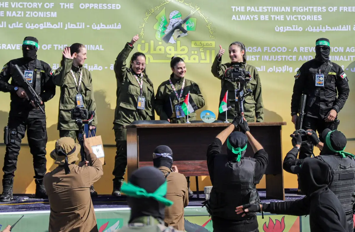 Milhares de palestinos se reuniram na Praça Palestina para a cerimônia de transferência das prisioneiras de guerra, incluindo dezenas de combatentes uniformizados das Brigadas Izz-ad al-Qassam, braço armado do Hamas.