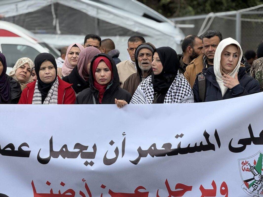 Palestinos, segurando faixas e cartazes, se reúnem em frente ao Hospital dos Mártires de Al-Aqsa para protestar contra o ”plano do presidente dos EUA, Donald Trump, de tomar Gaza” em 06 de fevereiro de 2025 em Deir-Al Balah, Gaza. [Abdallah F.s. Alattar/Agência Anadolu]