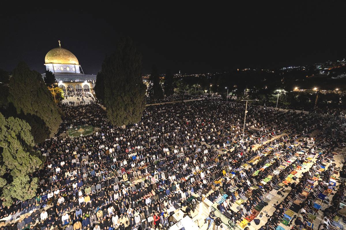 Palestinos realizam a oração de Tarawih em frente ao Domo da Rocha (Qubbat as-Sakhrah) na Mesquita de Al-Aqsa durante o Laylat al-Qadr, a 27ª noite do mês sagrado do Ramadã, apesar dos obstáculos impostos por Israel em Jerusalém em 26 de março de 2025. [Mostafa Alkharouf/Agência Anadolu]