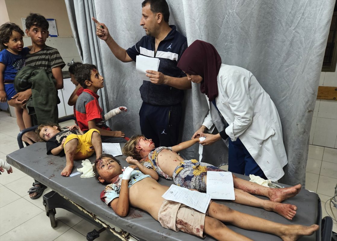 Crianças palestinas deslocadas e feridas após o ataque israelense a tendas improvisadas são vistas em uma maca após serem levadas ao Hospital Nasser para tratamento em Khan Yunis. Gaza em 07 de junho de 2025. [Hani Alshaer/Agência Anadolu]