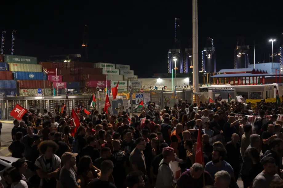 Os manifestantes, incluindo trabalhadores portuários e ativistas, estenderam bandeiras palestinas e cartazes de solidariedade no local, ao denunciarem o genocídio israelense em Gaza.