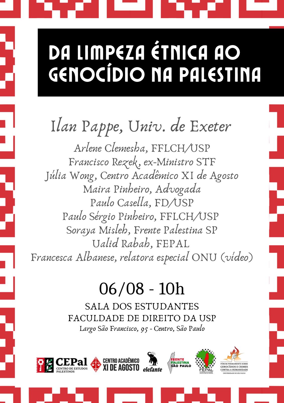 Em 6 de agosto, das 10 às 13 horas, Pappé estará na Sala dos Estudantes da Faculdade de Direito da USP (Largo São Francisco, 95), para a palestra de abertura do evento “Da limpeza étnica ao genocídio na Palestina”, com debate posterior — também organizado pelo CEPal, editora Elefante e outras organizações.