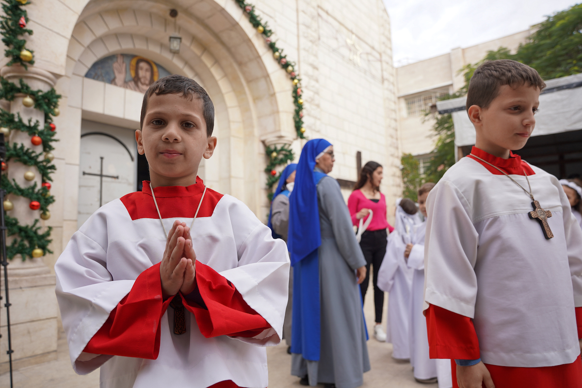 O patriarca chegou a Gaza como parte de sua visita anual de Natal para avaliar a situação dos cristãos após dois anos de ataques israelenses. Dezenas de católicos latinos participaram da missa, à medida que o feriado de 24 e 25 de dezembro se aproxima.