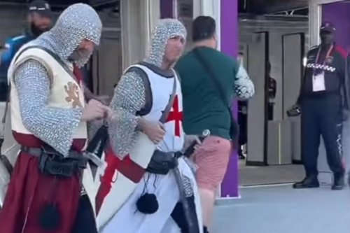 Seguranças catarianos impediram dois torcedores ingleses de entrar no Estádio al-Bayt para ver a partida entre sua seleção e os Estados Unidos, pela primeira fase da Copa do Mundo, porque ambos estavam vestidos como cruzados. A parafernália, foi dito pelos guardas, seria ofensiva. O jornal Times of London confirmou...
