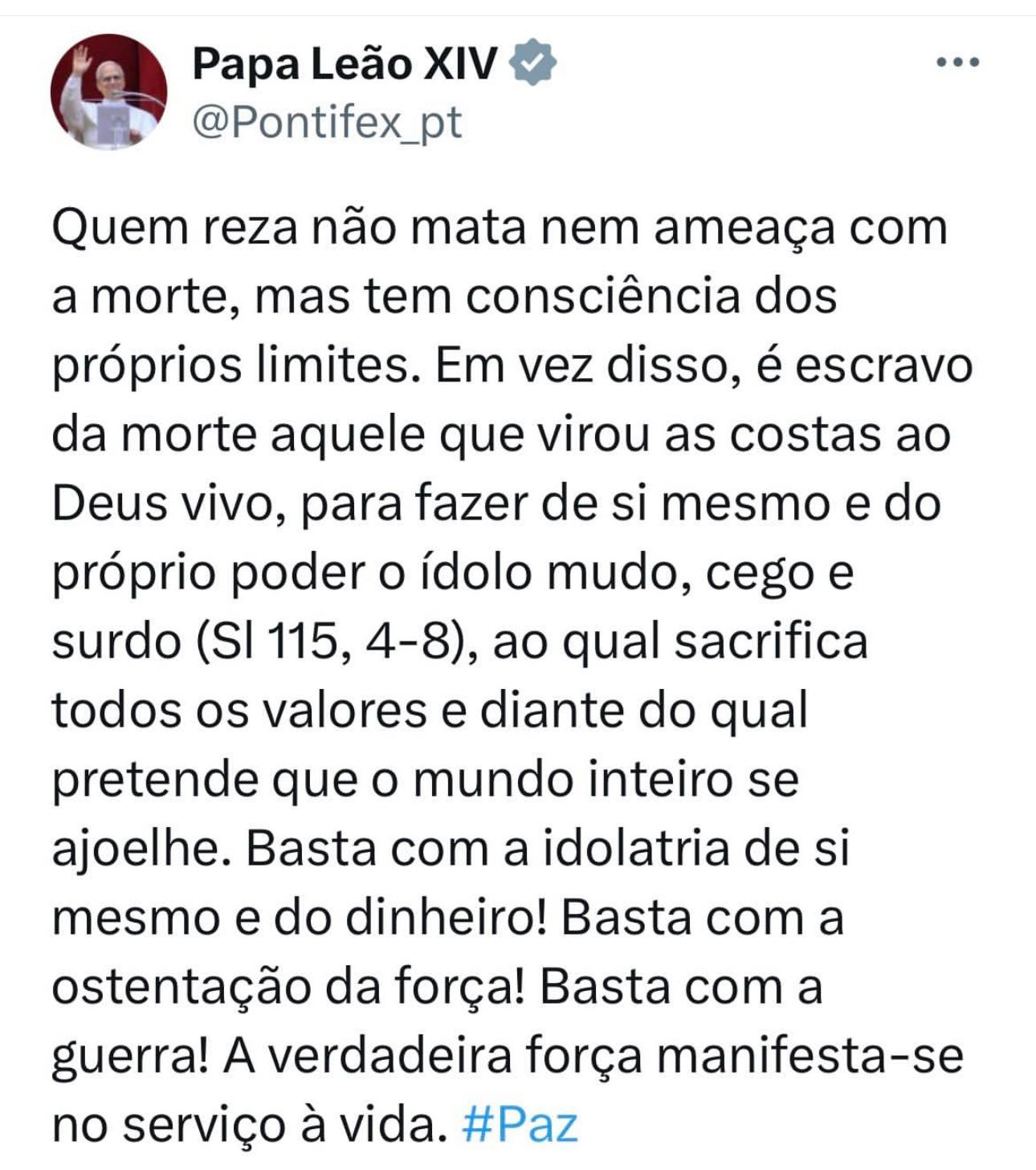 Durante uma vigília pela paz no Vaticano, o pontífice clamou pelo fim da “idolatria de si mesmo e do dinheiro” e da “exibição de força” de Trump. Ele usou o Salmo 115 nas redes sociais para condenar o que chamou de “idolatria do poder”, afirmando que “é escravo da morte aquele que virou as costas ao Deus vivo, para fazer de si mesmo e do próprio poder o ídolo mudo, cego e surdo”.