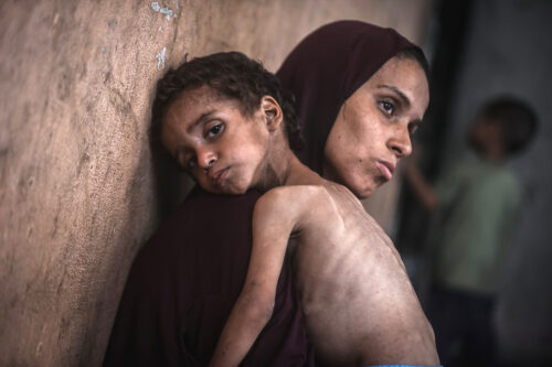 O palestino Yezen Abu Ful, de 2 anos, cuja saúde se deteriorou devido à falta de acesso a alimentos e suplementos nutricionais, é visto com sua mãe no Campo de Refugiados de Al-Shati, na Faixa de Gaza, em 24 de julho de 2025. [Ali Jadallah/Agência Anadolu]