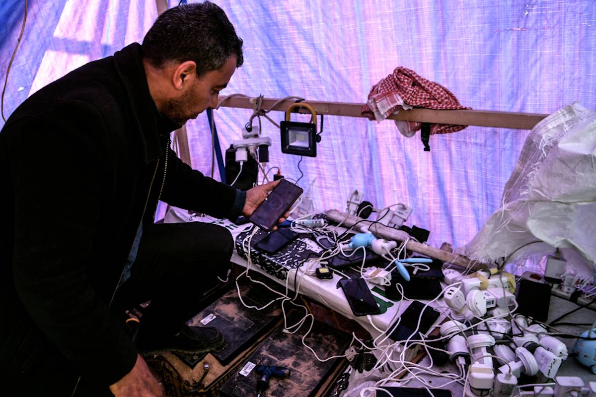 Cenas de Gaza: Refugiado transforma sua tenda em base de recarga de telefones celulares