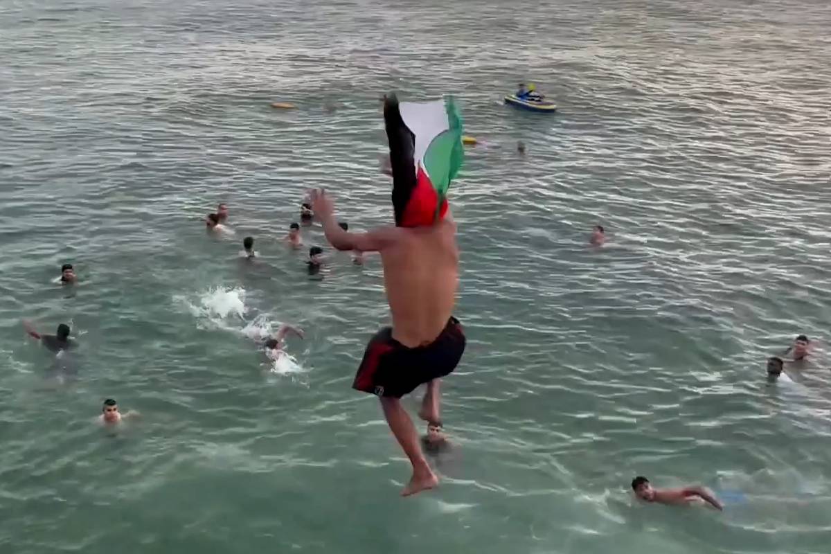 Palestinos mergulham nos mares de Gaza com bandeiras em punho