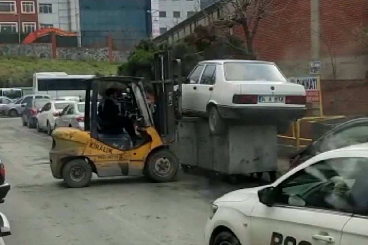 Mecânico coloca carro no alto de lixeira