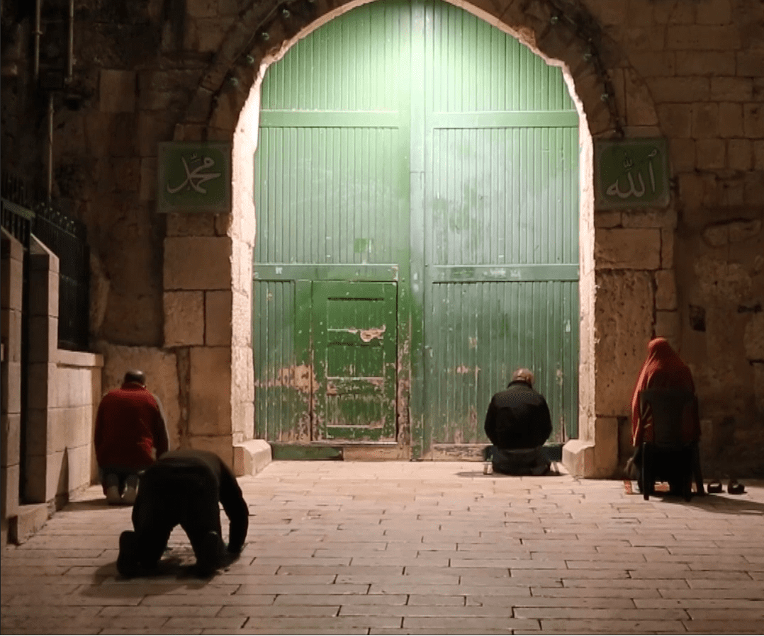 Palestinos mantêm distância social durante orações de Tarawih, no pátio de Al-Aqsa