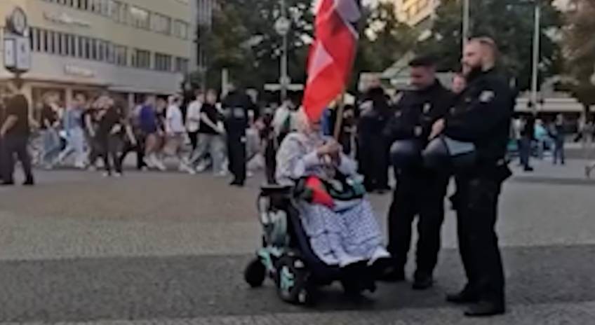 Senhora em cadeira de rodas desafia polícia alemã sobre postura antipalestina