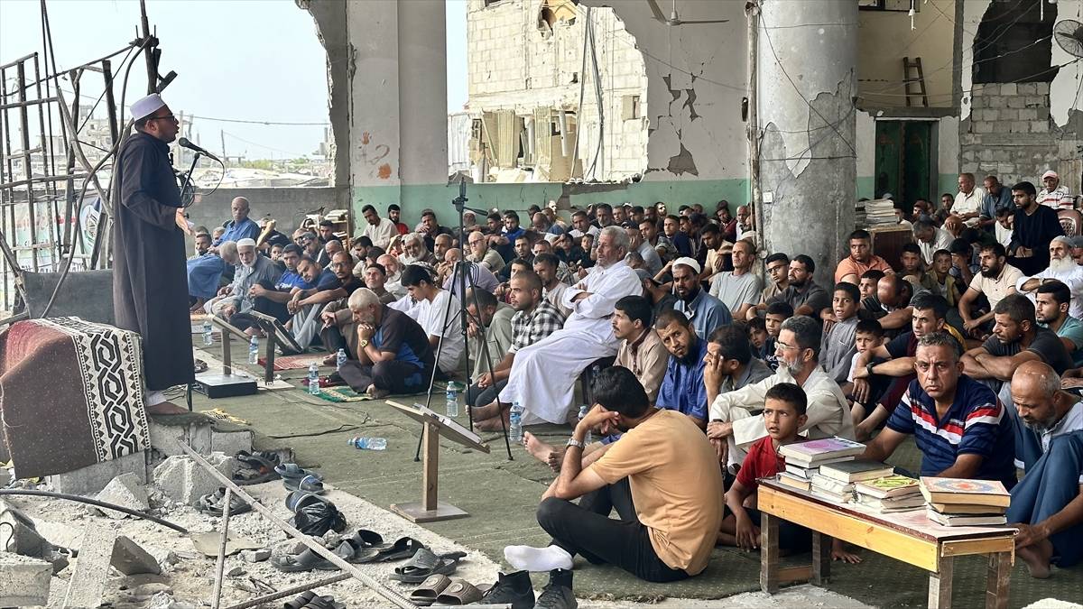 Palestinos realizam orações da sexta-feira nos escombros da mesquita bombardeada por Israel em Gaza