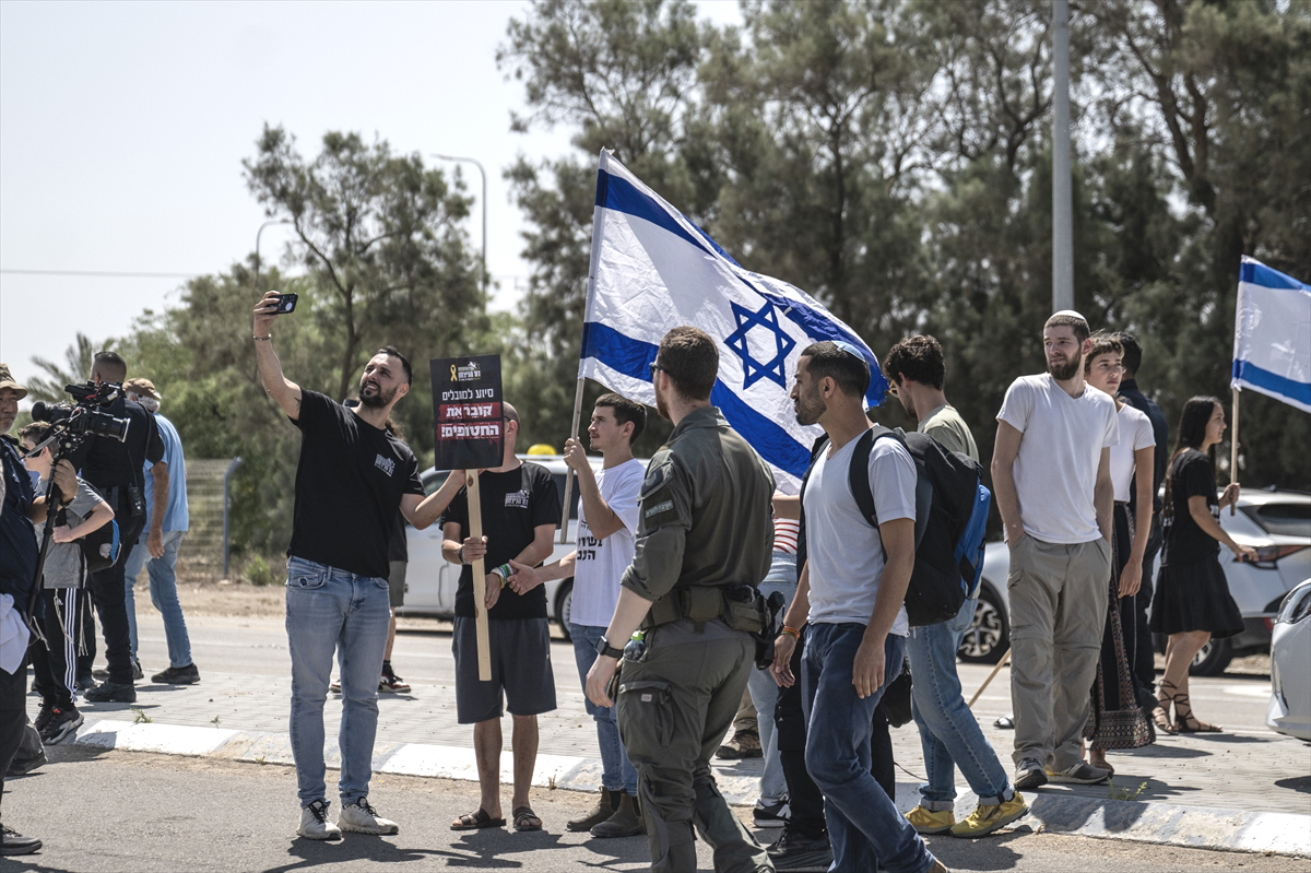 Grupos israelenses de extrema direita protestam perto da travessia de Kerem Shalom para bloquear caminhões de ajuda humanitária com destino a Gaza