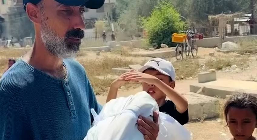 Criança cobre o corpo do irmão morto com as mãos, tenta protegê-lo do sol