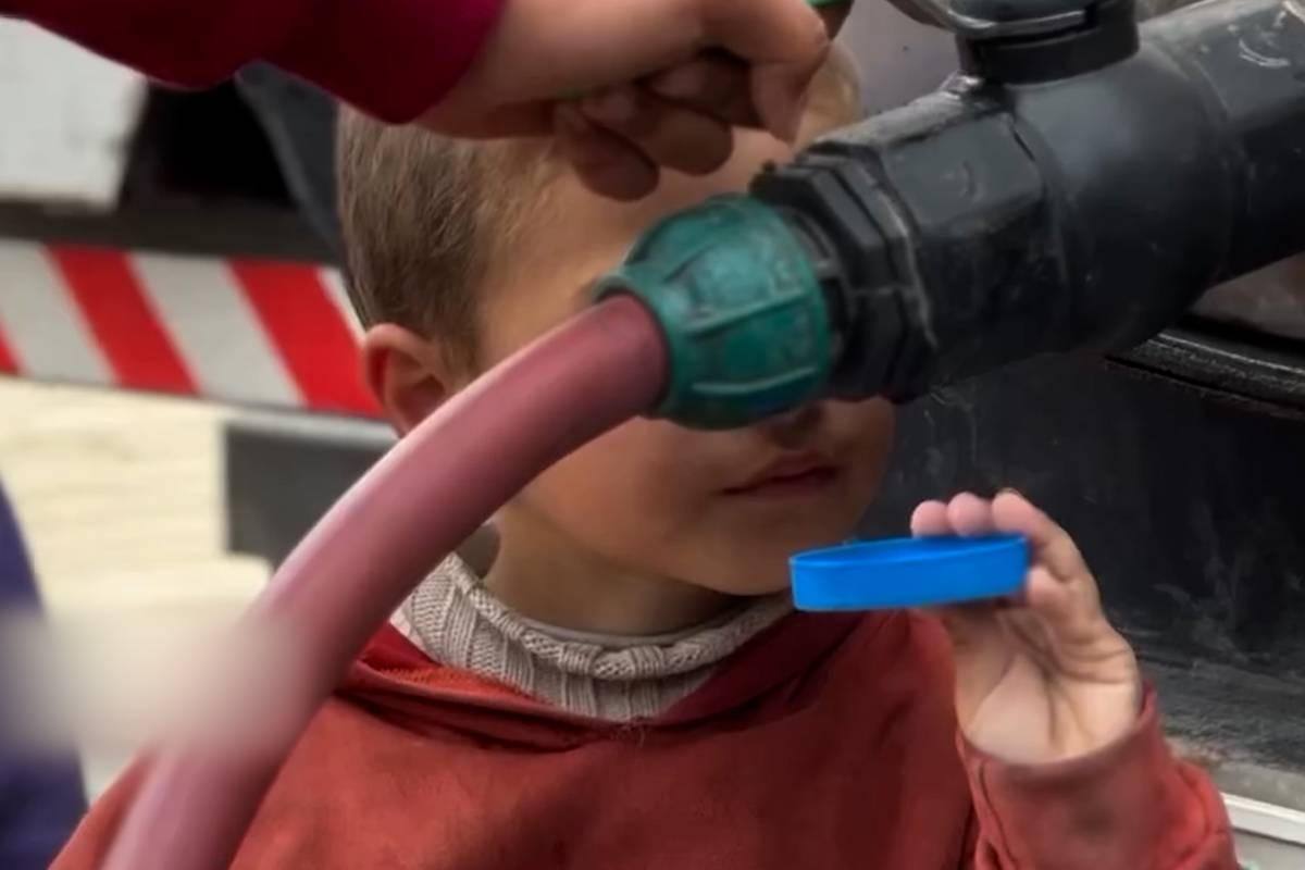 Uma criança palestina coleta gotas de água para encher sua garrafa em Gaza.