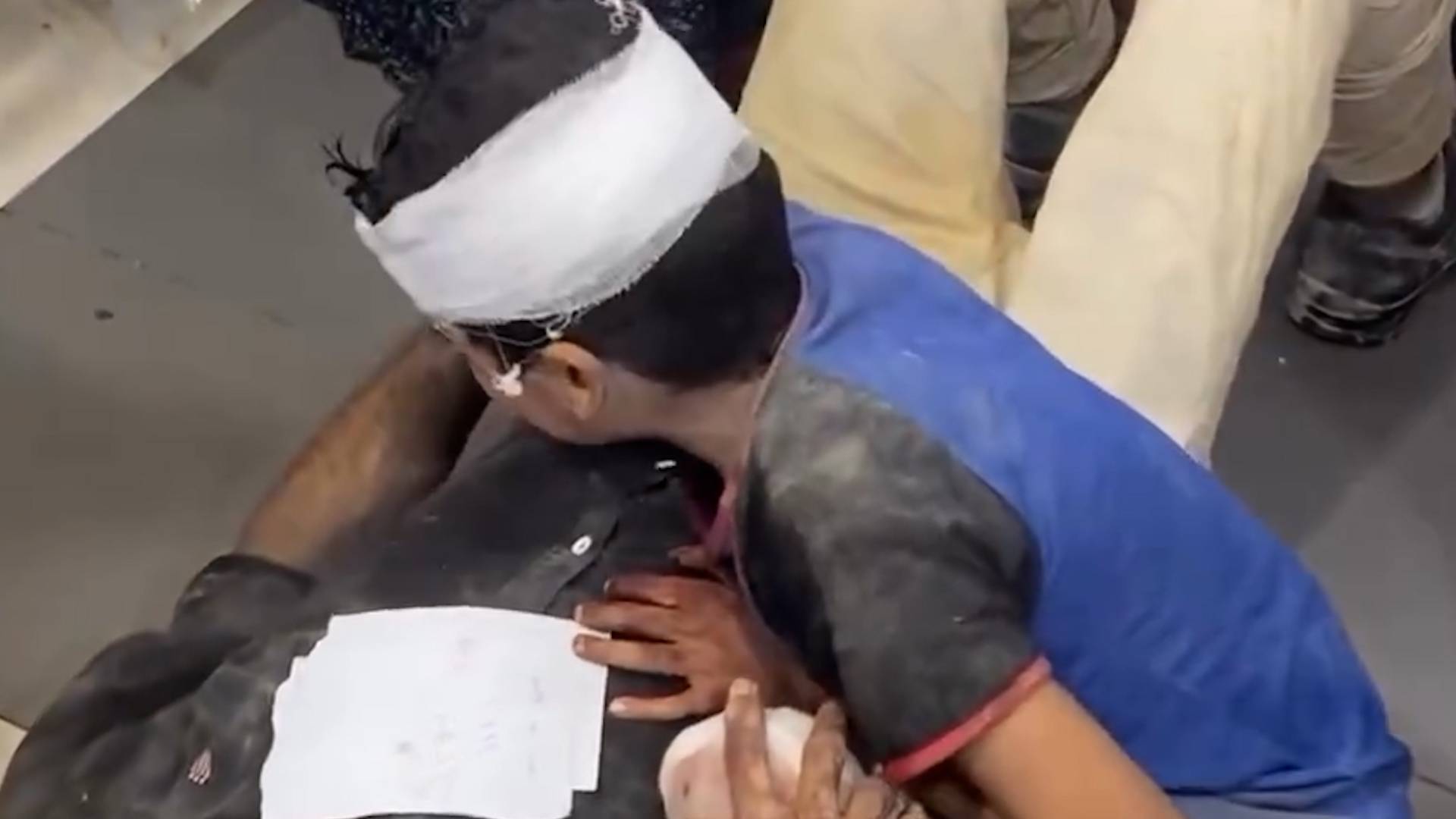 Menino abraça seu pai, ferido por um ataque aéreo israelense, em Gaza.