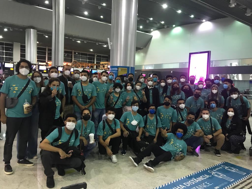 Jovens de orquestra brasileira tocam música regional durante voo para Dubai