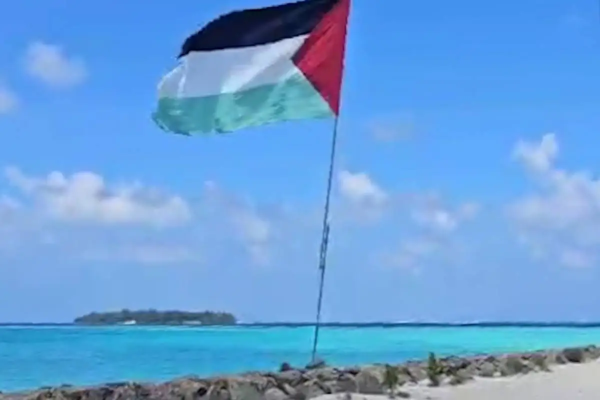 Bandeira palestina é hasteada em uma praia nas Maldivas