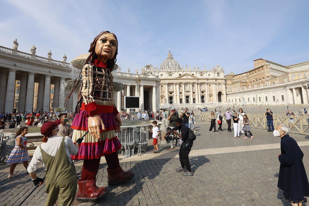 Boneca gigante de criança refugiada chega ao Parlamento Europeu