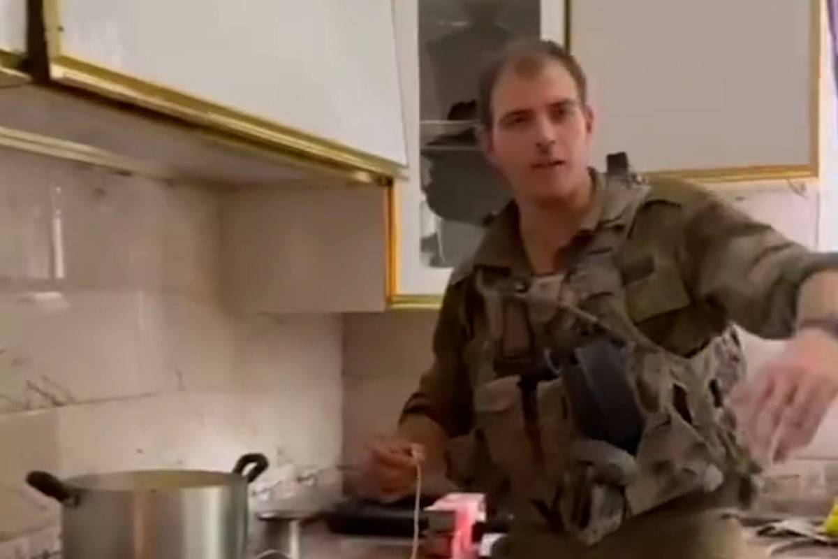 Soldado israelo-alemão cozinha em casa de palestinos deslocados