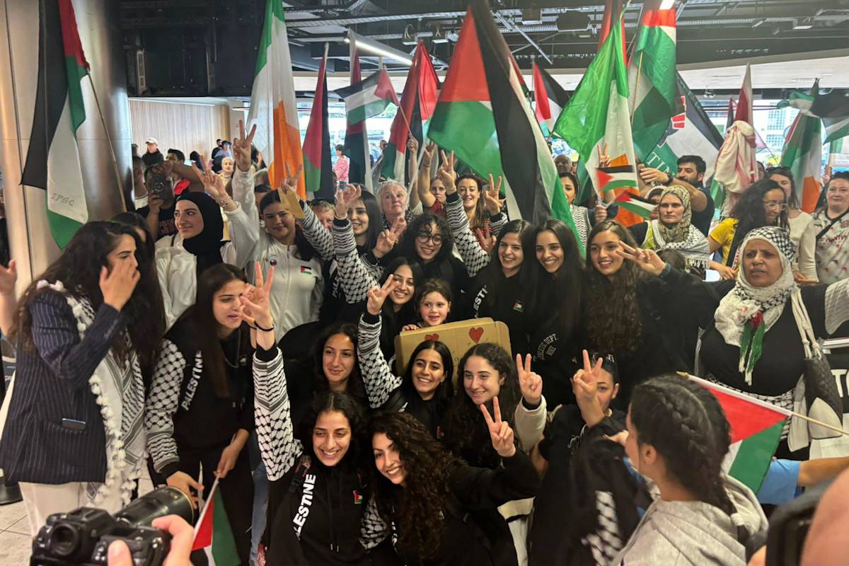 Participantes erguem bandeiras palestinas na maratona de Dublin