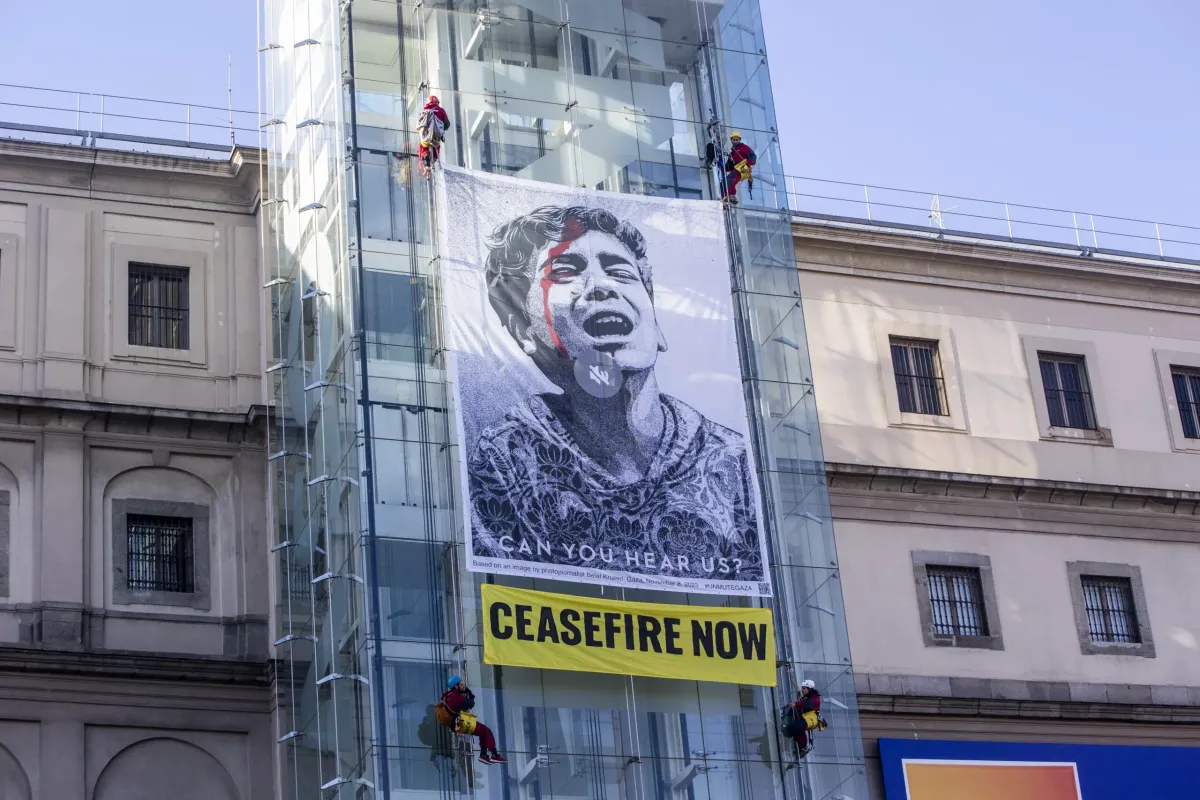 Museu em Madrid tem fachada coberta por cartaz antiguerra