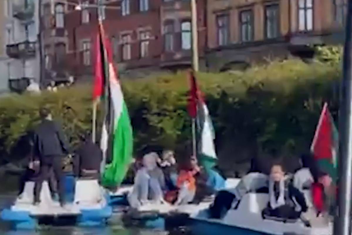 Barco mostra solidariedade a Gaza no Canal de Malmö na Suécia
