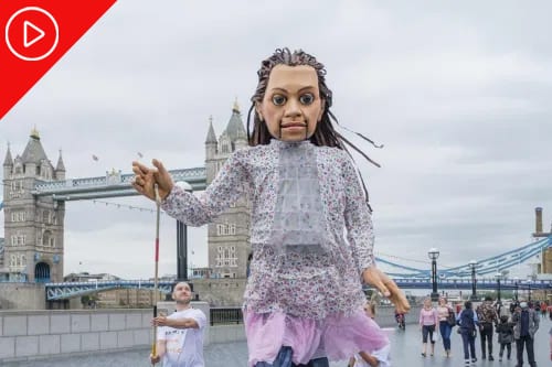Boneca gigante percorrerá oito mil km pelas crianças refugiadas