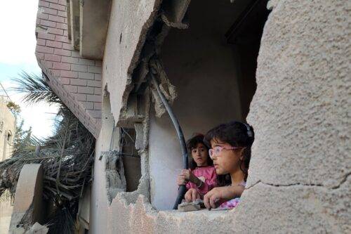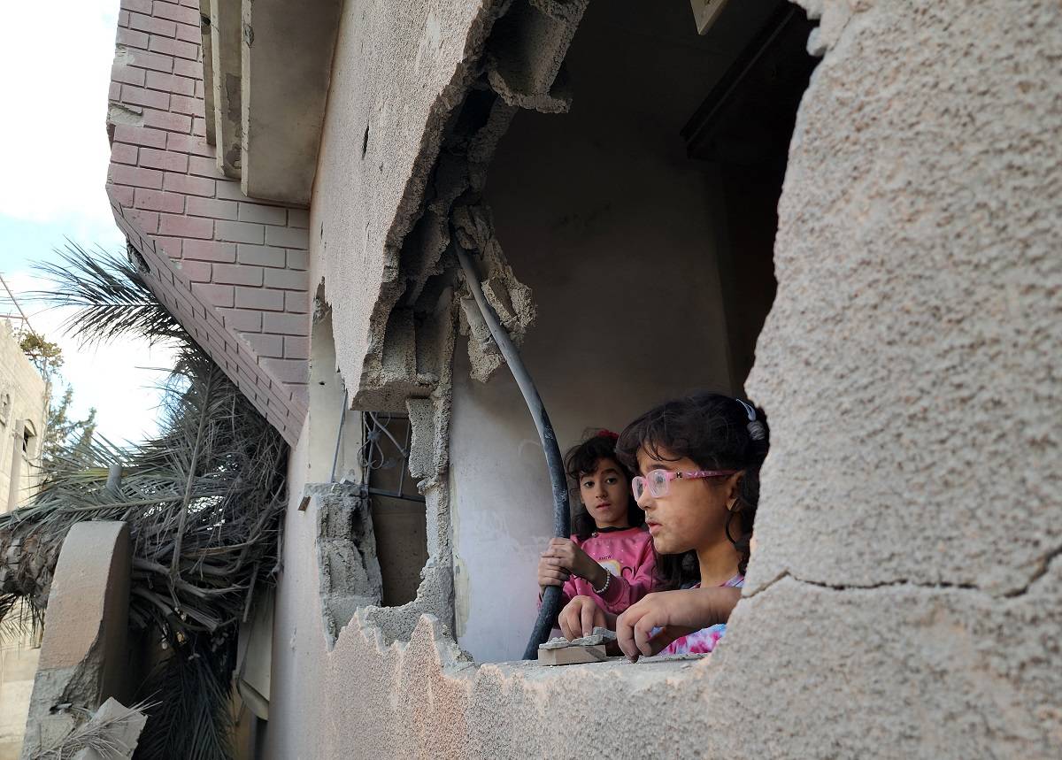 Meninas palestinas em prédio danificado enquanto equipe de defesa civil e moradores palestinos iniciam uma operação de busca e resgate de feridos e cerca de 40 mortos pelos ataques israelenses em Khan Yunis, Gaza, em 2 de outubro de 2024.[ Hani Alshaer/Anadolu via Getty Images]